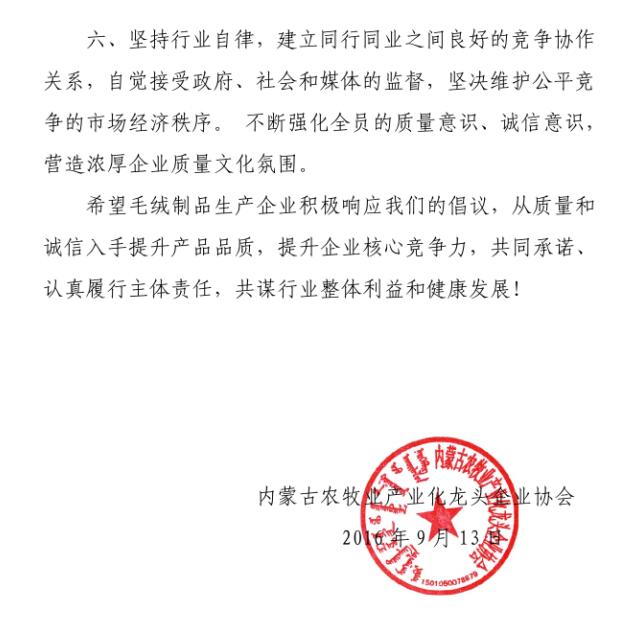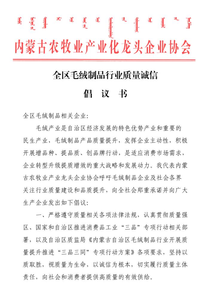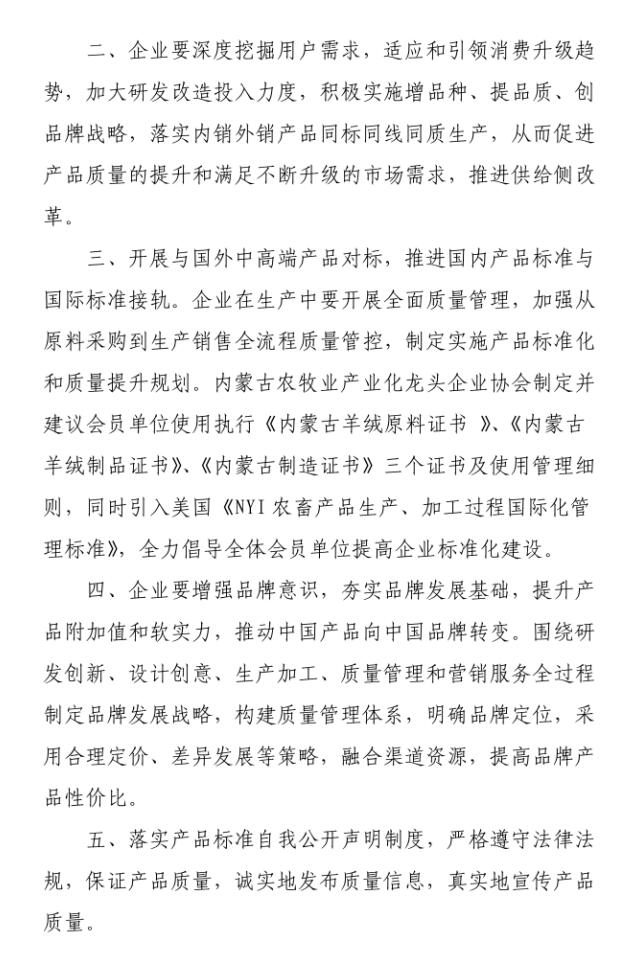 會(huì)上,質(zhì)監(jiān)局質(zhì)量監(jiān)督處副處長(zhǎng)艾繼青宣讀國(guó)務(wù)院辦公廳《關(guān)于開(kāi)展消費(fèi)品工業(yè)“三品”專(zhuān)項(xiàng)行動(dòng)營(yíng)造良好市場(chǎng)環(huán)境的若干意見(jiàn)》;孫磐處長(zhǎng)向與會(huì)人員通報(bào)了近年羊絨監(jiān)督抽查的質(zhì)量狀況基本情況,并傳達(dá)了內(nèi)蒙古質(zhì)監(jiān)局印發(fā)的毛絨制品行業(yè)質(zhì)量提升推進(jìn)“三品三同”專(zhuān)項(xiàng)行動(dòng)方案;纖維檢驗(yàn)局總工程師曹渭芳介紹了纖檢局助力企業(yè)產(chǎn)品質(zhì)量提升檢驗(yàn)?zāi)芰Φ姆?wù)舉措;協(xié)會(huì)副會(huì)長(zhǎng)、羊絨分會(huì)名譽(yù)會(huì)長(zhǎng)單位鄂爾多斯羊絨集團(tuán),協(xié)會(huì)副會(huì)長(zhǎng)、內(nèi)蒙古鹿王羊絨制品有限公司及內(nèi)蒙古豐蒂妮羊絨制品有限公司三家企業(yè)相關(guān)負(fù)責(zé)人介紹了各自企業(yè)在落實(shí)國(guó)家和自治區(qū)羊絨產(chǎn)業(yè)政策、加快企業(yè)轉(zhuǎn)型升級(jí)和產(chǎn)品質(zhì)量提升方面的先進(jìn)經(jīng)驗(yàn);內(nèi)蒙古農(nóng)牧業(yè)產(chǎn)業(yè)化龍頭企業(yè)協(xié)會(huì)常務(wù)秘書(shū)長(zhǎng)劉俊青代表行業(yè)協(xié)會(huì)向全區(qū)毛絨制品相關(guān)企業(yè)發(fā)起全區(qū)毛絨制品行業(yè)誠(chéng)信倡議書(shū),呼吁毛絨制品企業(yè)從質(zhì)量和誠(chéng)信入手,提升產(chǎn)品品質(zhì),提升企業(yè)核心競(jìng)爭(zhēng)力,認(rèn)真履行責(zé)任,共同推進(jìn)行業(yè)整體利益和健康發(fā)展。