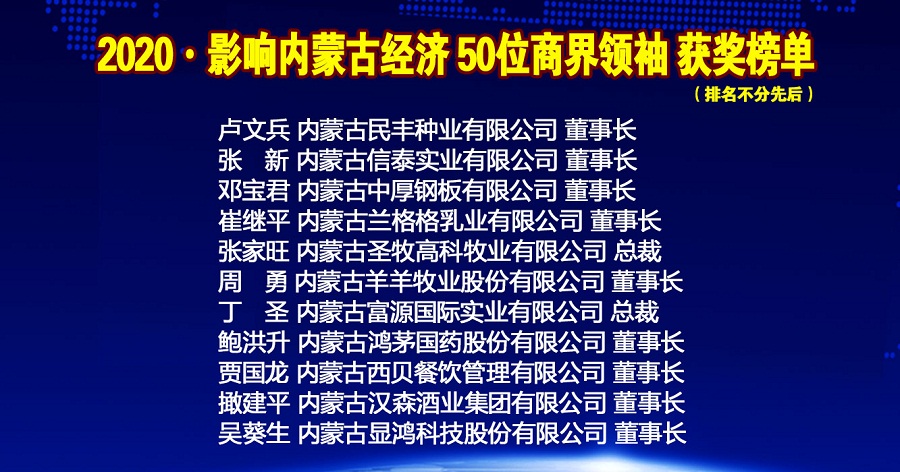 年會上內(nèi)蒙古金融網(wǎng)、內(nèi)蒙古新金融研究院隆重推出2020•影響內(nèi)蒙古經(jīng)濟(jì)50位商界領(lǐng)袖榜單,從2015年度開始,每年按照項目發(fā)展,甄選出當(dāng)年度引領(lǐng)商界風(fēng)潮的50位內(nèi)蒙古最具影響力的商界領(lǐng)袖。