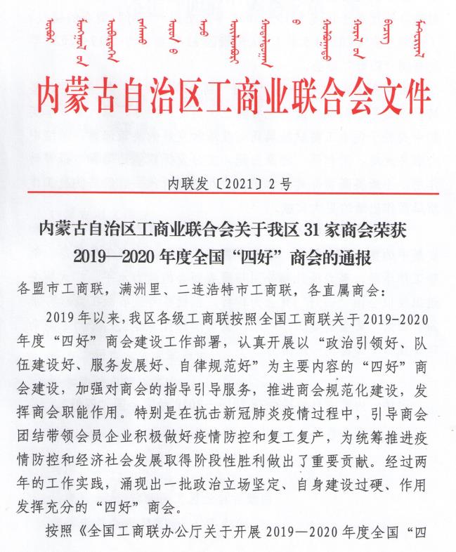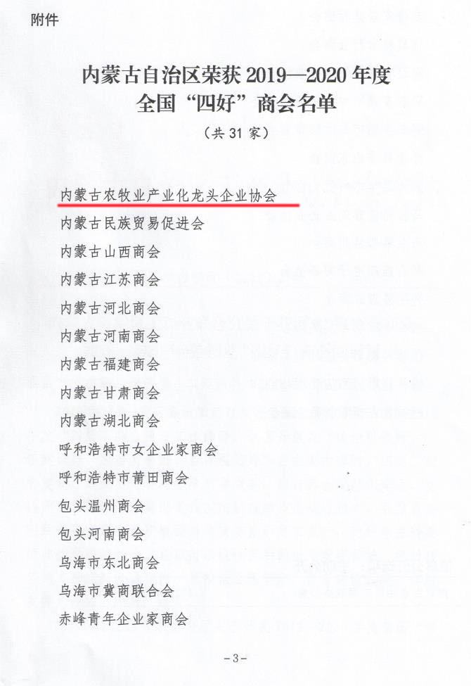 標題:喜報!內蒙古農牧業(yè)產業(yè)化龍頭企業(yè)協(xié)會榮獲全國“四好”商會榮譽稱號
