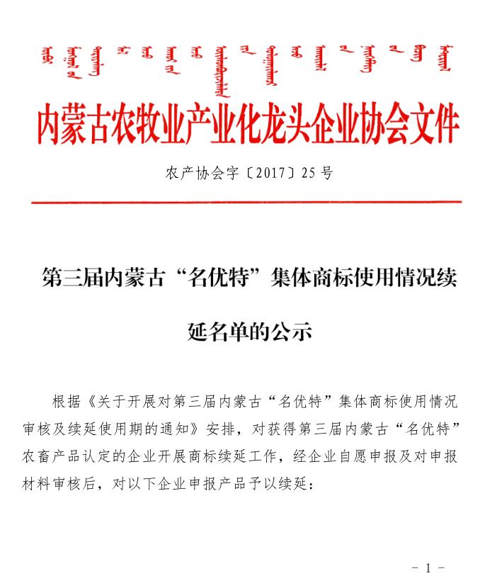 第三屆內蒙古“名優(yōu)特”集體商標使用情況續(xù)延名單的公示