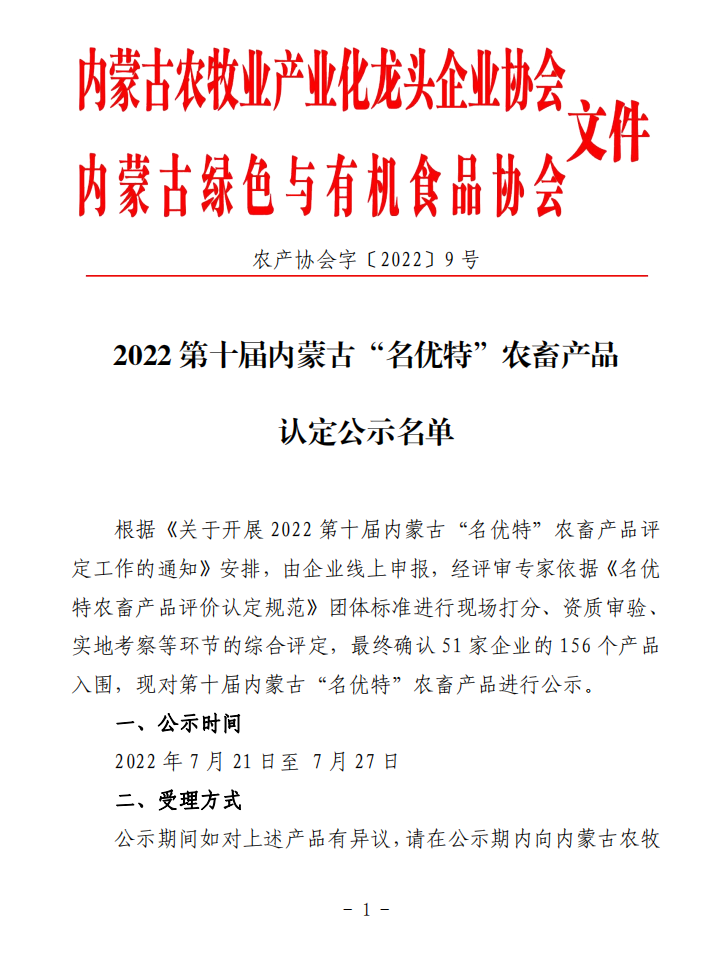 2022第十屆內(nèi)蒙古“名優(yōu)特”農(nóng)畜產(chǎn)品認定公示名單