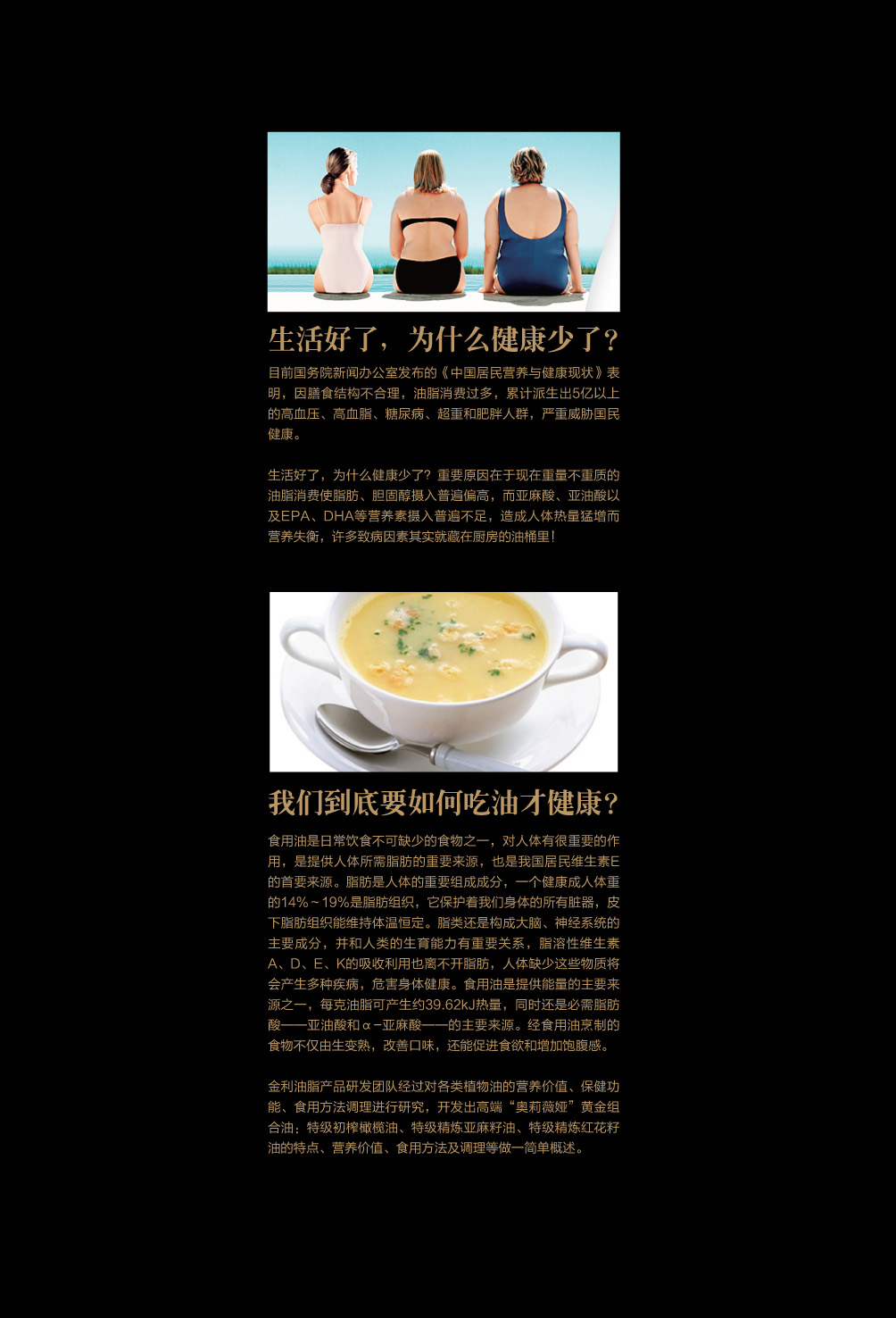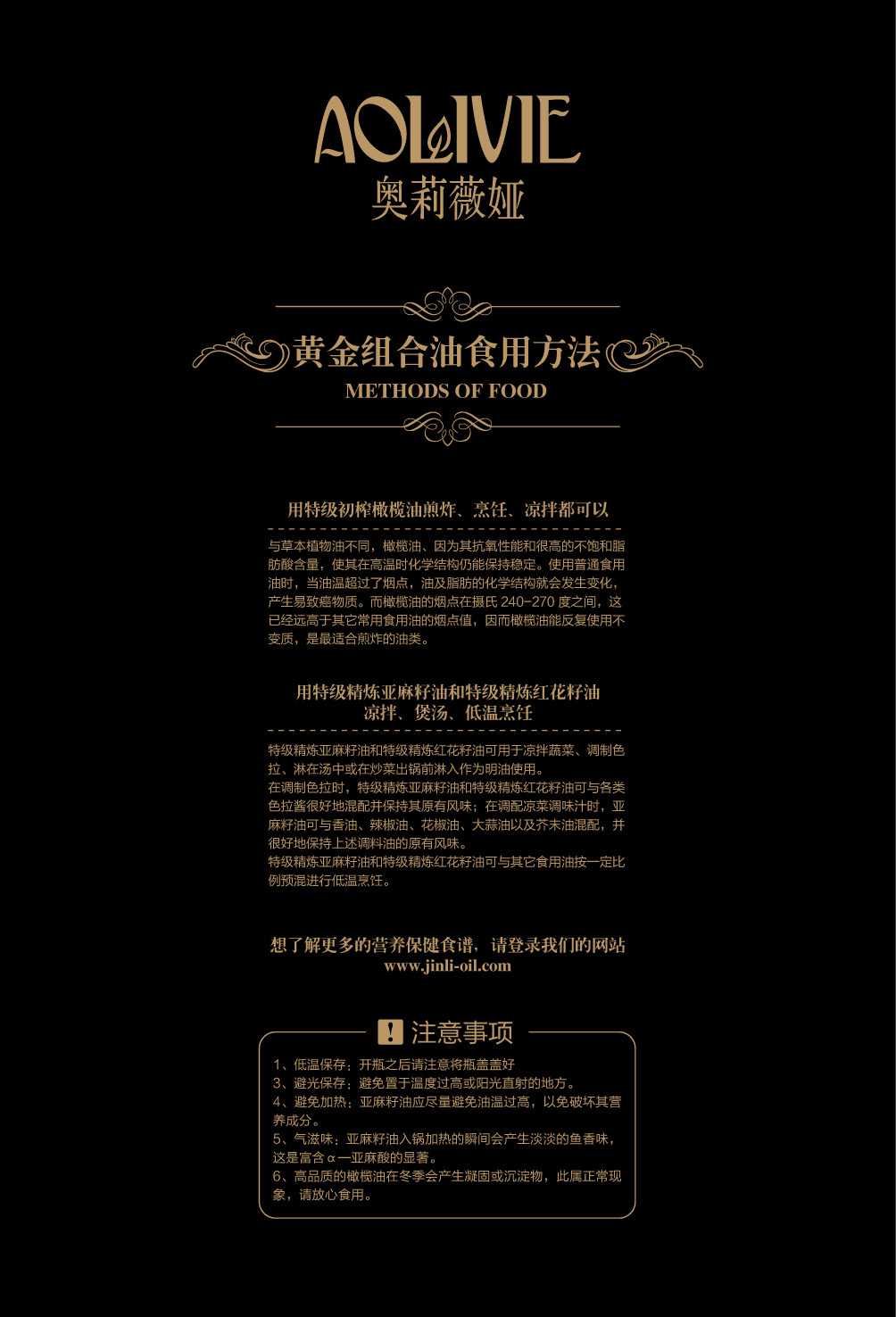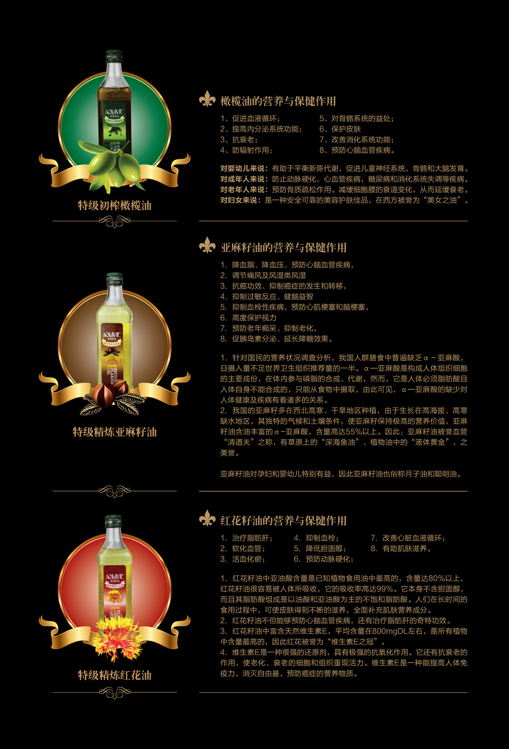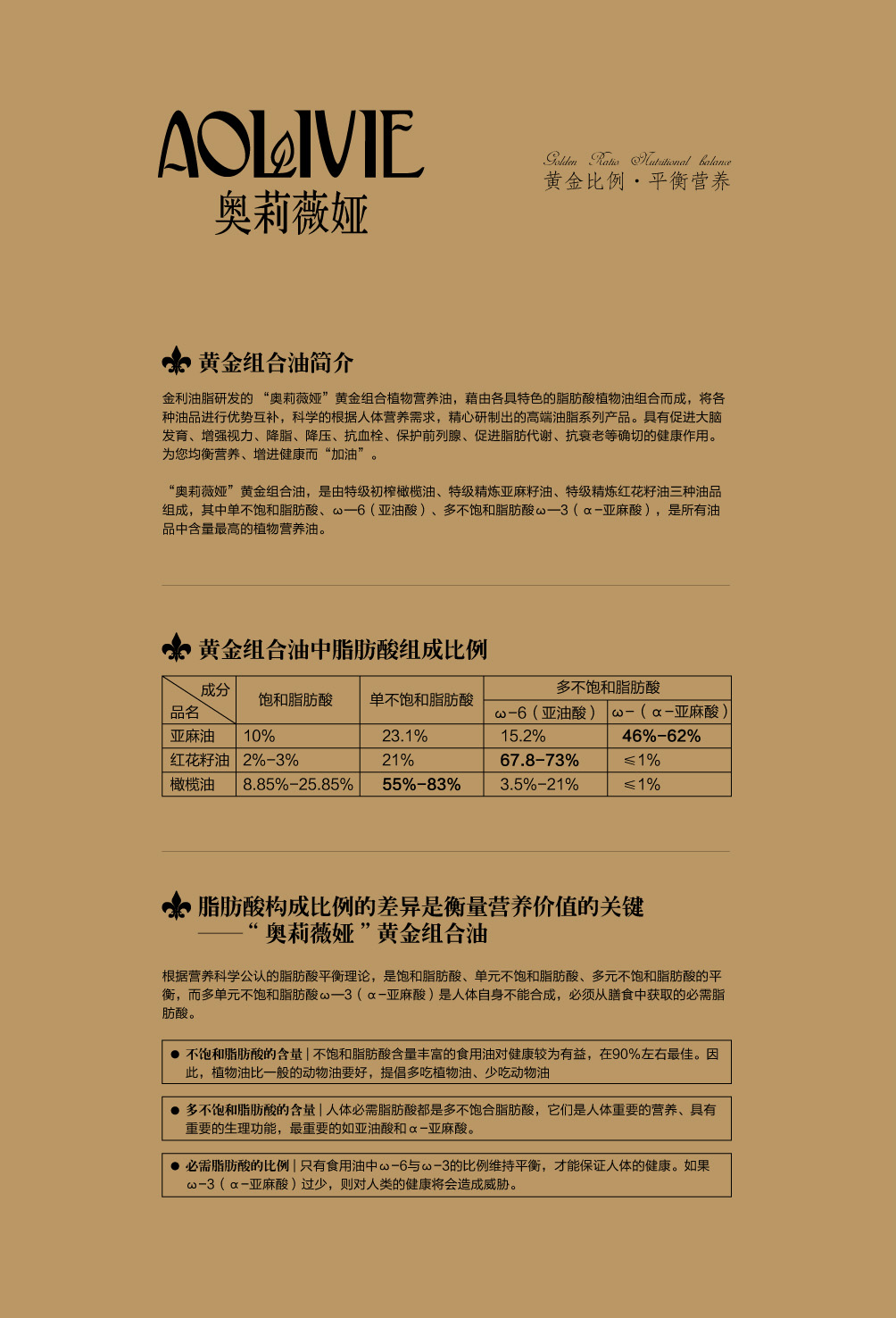 金利油脂(蘇州)有限公司研發(fā)的:“奧莉薇婭黃金組合植物營養(yǎng)油,有各具特色的脂肪酸植物油組合而成,將各種油品進行優(yōu)勢互補,科學的根據(jù)人體營養(yǎng)需求,精心研制出的高端油脂系列產(chǎn)品。具有促進大腦發(fā)育/增強視力/降脂/降血壓/抗血栓/保護前列腺/促進脂肪代謝/抗衰老等良好的保健作用。為您均衡營養(yǎng)/增強體質(zhì)而“加油”。“奧莉薇婭黃金組合油,是有特級初榨橄欖油/特級冷榨亞麻籽油/特級精煉紅花籽油三種油品組成,其中單不飽和脂肪酸/α—亞麻酸和亞油酸,是所有植物油中含量最高植物營養(yǎng)油。